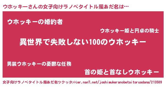 | 男性向けラノベタイトル風あだ名 | 『ウホッキーという概念が存在しない退屈な世界 』 |