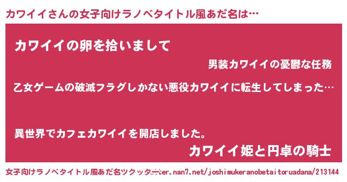 カワイイさんの女子向けラノベタイトル風あだ名は… 『乙女ゲームの破滅フラグしかない悪役カワイイに転生してしまった…』『カワイイの卵を拾いまして』『カワイイ姫と円卓の騎士』 ツクッター #女子向けラノベタイトル風あだ名ツクッター http://tkutter.nan7.net/joshimukeranobetaitoruadana/213144/