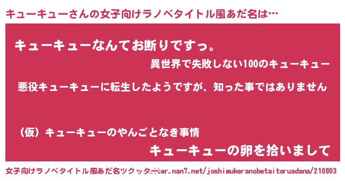 | 胡散臭い通販商品みたいなあだ名 | 『あなたにだけ特別に提供する100年もののヴィンテージワイン…その名も「キューキュー」』 |