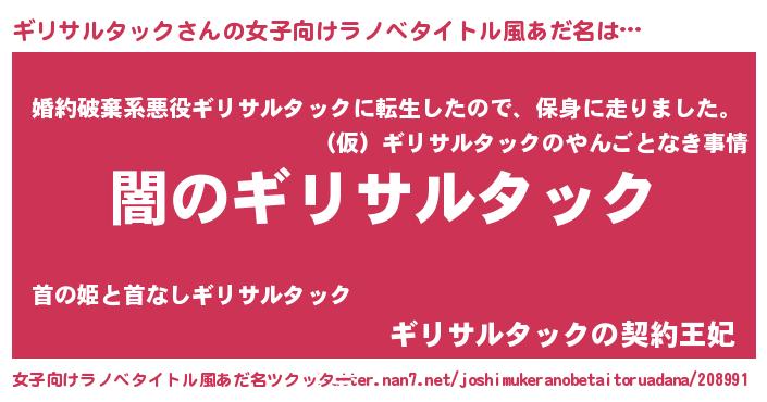 | 男性向けラノベタイトル風あだ名 | 『Re:ギリサルタックから始める異世界生活』 |