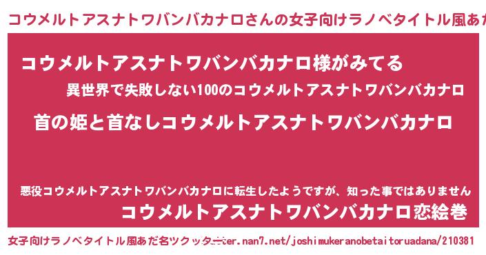| 男性向けラノベタイトル風あだ名 | 『はたらくコウメルトアスナトワバンバカナロさま!』 |