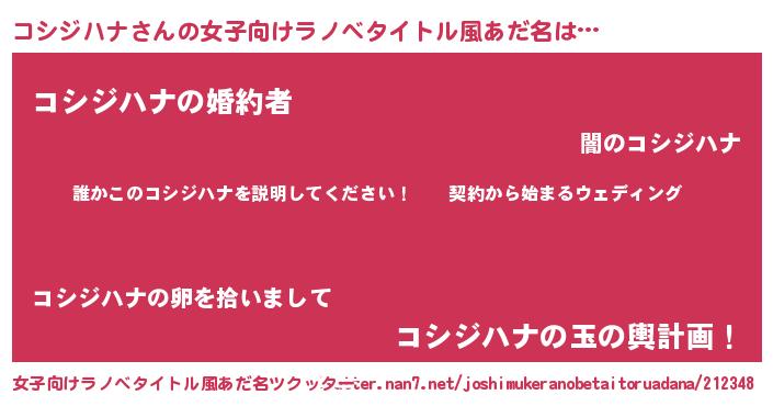コシジハナさんの女子向けラノベタイトル風あだ名は… 『誰かこのコシジハナを説明してください! ~契約から始まるウェディング~』『コシジハナの婚約者』『コシジハナの玉の輿計画!』 ツクッター #女子向けラノベタイトル風あだ名ツクッター http://tkutter.nan7.net/joshimukeranobetaitoruadana/212348/
