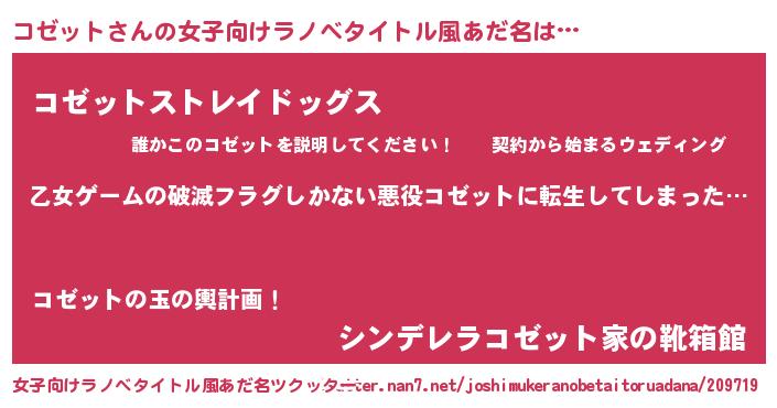 | 男性向けラノベタイトル風あだ名 | 『この素晴らしい世界にコゼットを!』 |