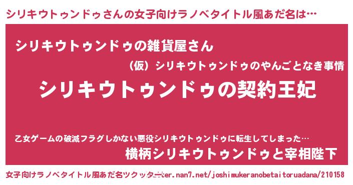| 男性向けラノベタイトル風あだ名 | 『シリキウトゥンドゥという概念が存在しない退屈な世界 』 |