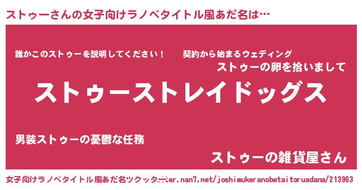 | 男性向けラノベタイトル風あだ名 | 『Re:ストゥーから始める異世界生活』 |