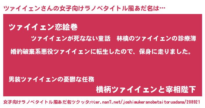 | 男性向けラノベタイトル風あだ名 | 『ツァイイェンスレイヤー』 |