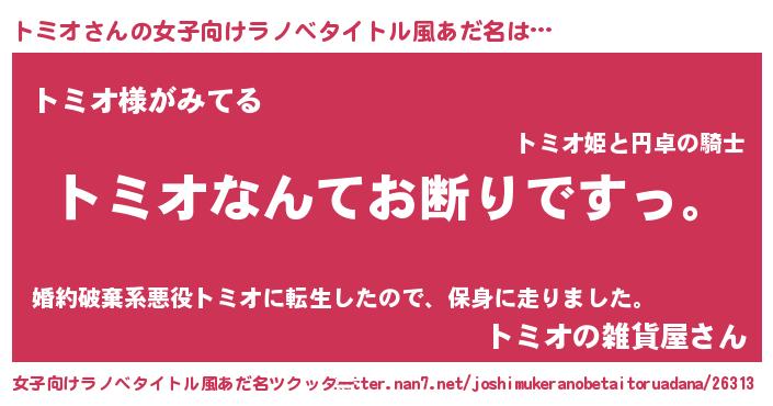 | 男性向けラノベタイトル風あだ名 | 『魔法科高校のトミオ』『トミオの憂鬱』 |