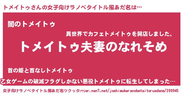 | 男性向けラノベタイトル風あだ名 | 『おまえをオタクにしてやるから、俺をトメイトゥにしてくれ! 』 |