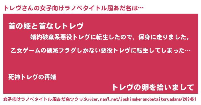 | 男性向けラノベタイトル風あだ名 | 『この素晴らしい世界にトレヴを!』 |