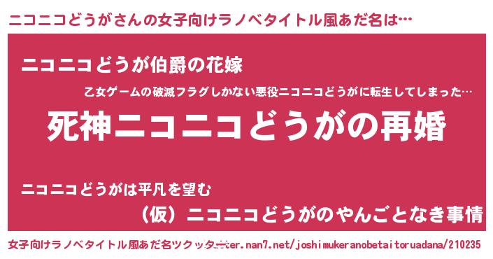 | 男性向けラノベタイトル風あだ名 | 『ノーゲーム・ノーニコニコドウガ』 |