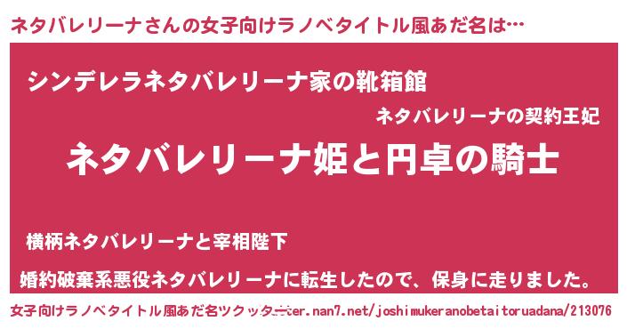 ネタバレリーナさんの女子向けラノベタイトル風あだ名は… 『ネタバレリーナ姫と円卓の騎士』『シンデレラネタバレリーナ家の靴箱館』『婚約破棄系悪役ネタバレリーナに転生したので、保身に走りました。』 ツクッター #女子向けラノベタイトル風あだ名ツクッター http://tkutter.nan7.net/joshimukeranobetaitoruadana/213076/