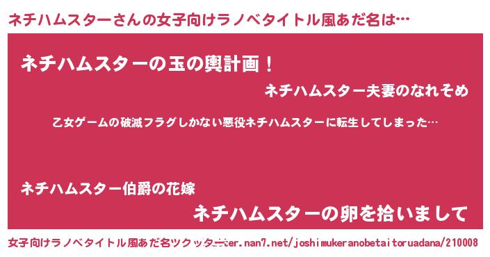 | 男性向けラノベタイトル風あだ名 | 『この素晴らしい世界にネチハムスターを!』 |
