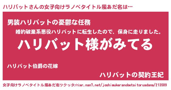 | 男性向けラノベタイトル風あだ名 | 『ハリバットの嫁は女の子じゃないと思った?』 |
