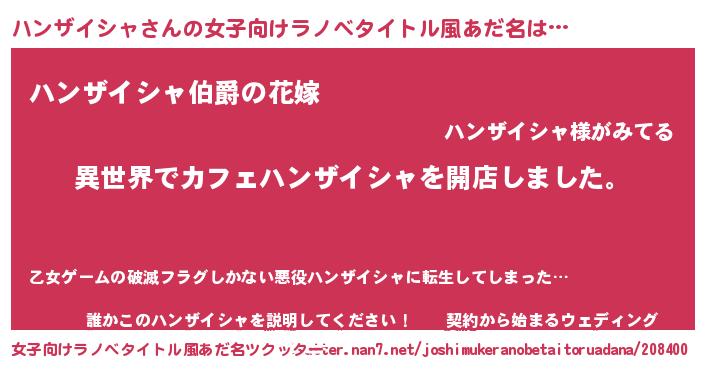 ハンザイシャさんの女子向けラノベタイトル風あだ名は… 『異世界でカフェハンザイシャを開店しました。』『ハンザイシャ伯爵の花嫁』『誰かこのハンザイシャを説明してください! ~契約から始まるウェディング~』 ツクッター #女子向けラノベタイトル風あだ名ツクッター http://tkutter.nan7.net/joshimukeranobetaitoruadana/208400/