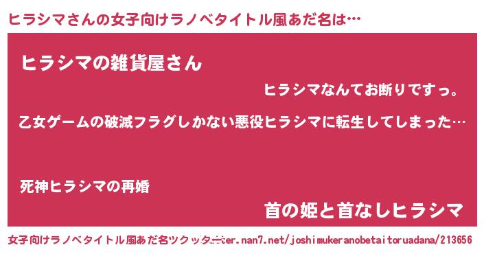 | 男性向けラノベタイトル風あだ名 | 『魔弾の王とヒラシマ』 |