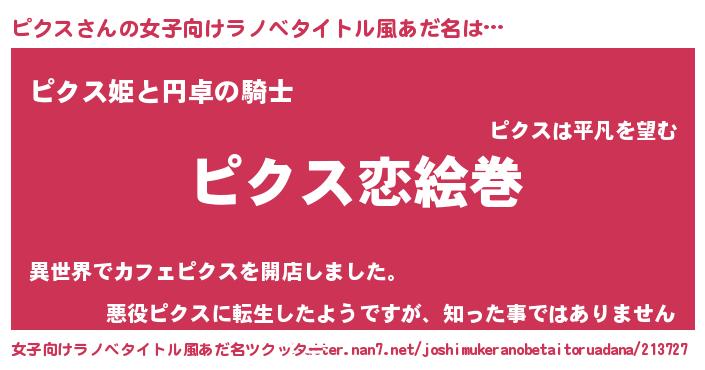 | 男性向けラノベタイトル風あだ名 | 『おまえをオタクにしてやるから、俺をピクスにしてくれ! 』 |