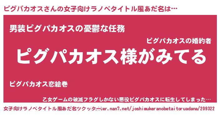 | 男性向けラノベタイトル風あだ名 | 『ピグパカオスの嫁は女の子じゃないと思った?』 |