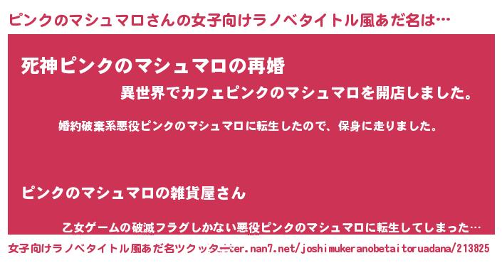 | 男性向けラノベタイトル風あだ名 | 『ピンクノマシュマロスレイヤー』 |