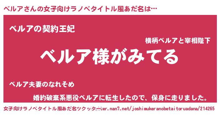 | 男性向けラノベタイトル風あだ名 | 『ベルアの嫁は女の子じゃないと思った?』 |