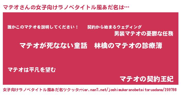 | 男性向けラノベタイトル風あだ名 | 『魔弾の王とマテオ』 |