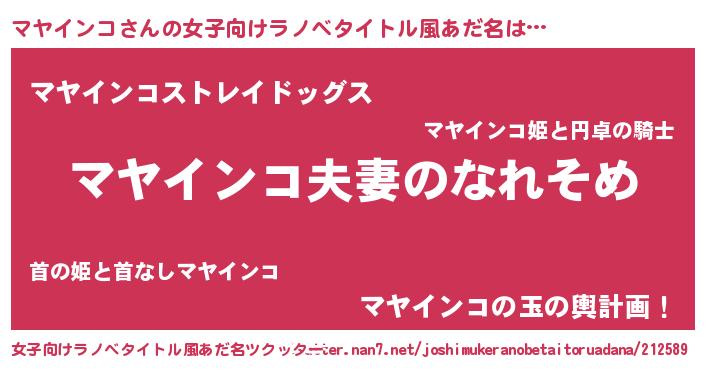 | 男性向けラノベタイトル風あだ名 | 『おまえをオタクにしてやるから、俺をマヤインコにしてくれ! 』 |