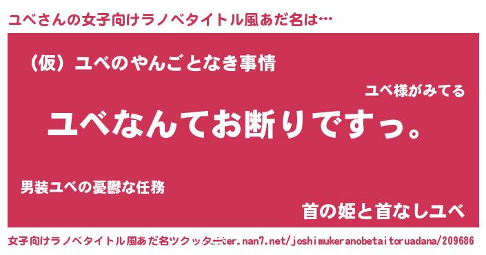 ユベさんの女子向けラノベタイトル風あだ名は… 『ユベなんてお断りですっ。』『(仮)ユベのやんごとなき事情』『首の姫と首なしユベ』 ツクッター #女子向けラノベタイトル風あだ名ツクッター http://tkutter.nan7.net/joshimukeranobetaitoruadana/209686/