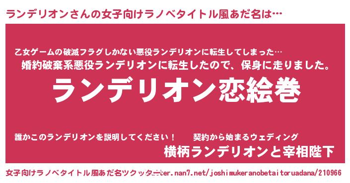 | 男性向けラノベタイトル風あだ名 | 『おまえをオタクにしてやるから、俺をランデリオンにしてくれ! 』 |