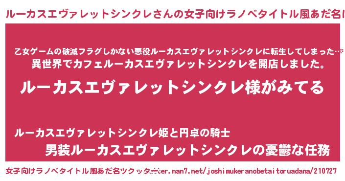 | 男性向けラノベタイトル風あだ名 | 『ルーカスエヴァレットシンクレの嫁は女の子じゃないと思った?』 |