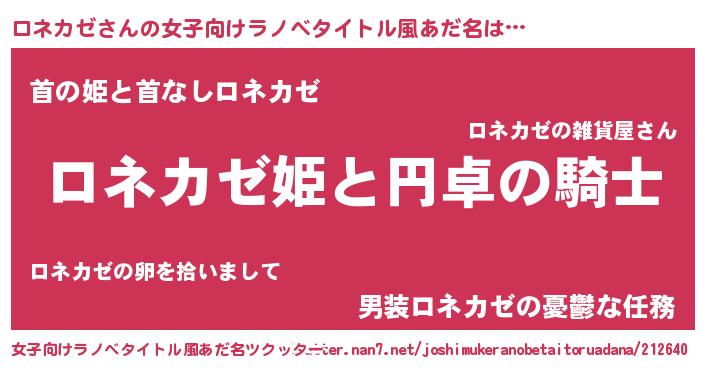ロネカゼさんの女子向けラノベタイトル風あだ名は… 『ロネカゼ姫と円卓の騎士』『首の姫と首なしロネカゼ』『男装ロネカゼの憂鬱な任務』 ツクッター #女子向けラノベタイトル風あだ名ツクッター http://tkutter.nan7.net/joshimukeranobetaitoruadana/212640/