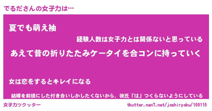 | ヘコむあだ名 | 『でるにゅー』『なまこ酢』『でるを』 |