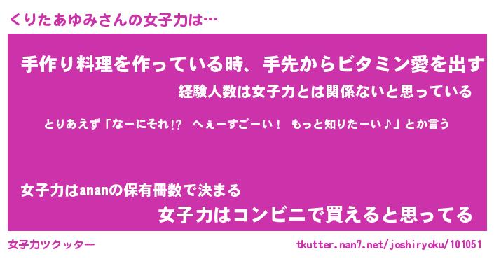 | 恥ずかしいあだ名 | 『プリティーくりたあゆみ』『くりっちょ』 |