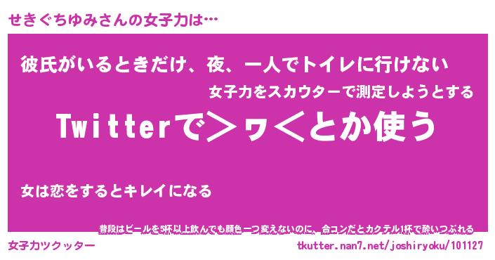 | 男性向けラノベタイトル風あだ名 | 『せきぐちゆみの憂鬱』 |