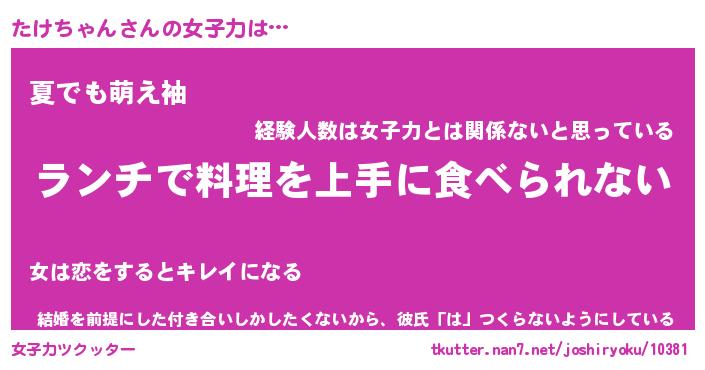 | ヘコむあだ名 | 『たけもー』『なまこ酢』『たけっ子』 |
