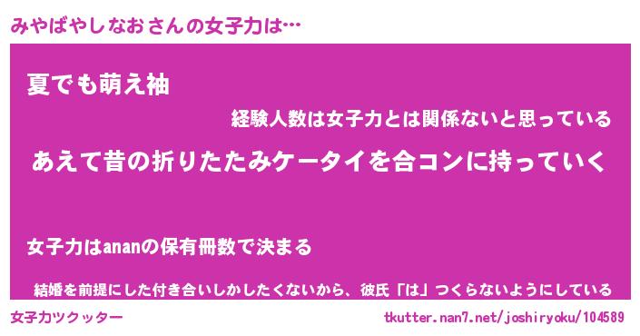 | 女子向けラノベタイトル風あだ名 | 『(仮)みやばやしなおのやんごとなき事情』 |