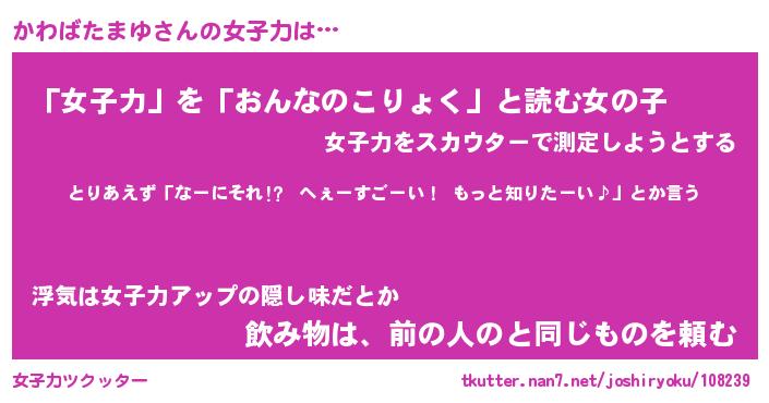 | 恥ずかしいあだ名 | 『プリティーかわばたまゆ』『かわっちょ』 |