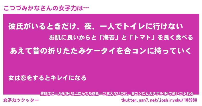 | 恥ずかしいあだ名 | 『プリティーこつづみかな』『こつっちょ』 |