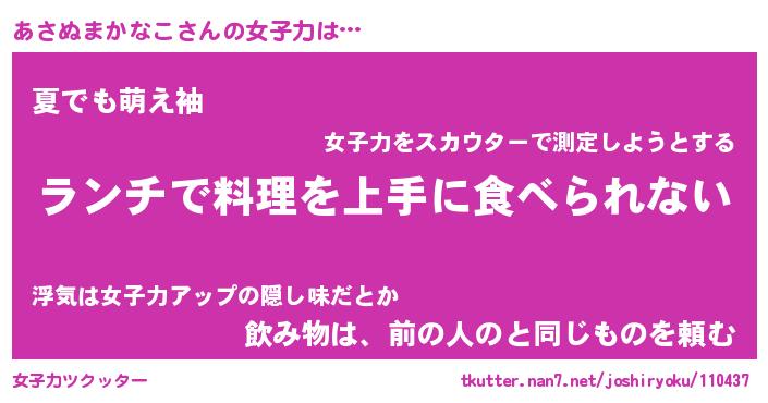 | ヘコむあだ名 | 『あさふぇ~』『なまこ酢』 |