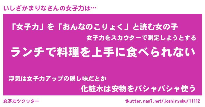 | 恥ずかしいあだ名 | 『プリティーいしざかまりな』『いしちん』 |