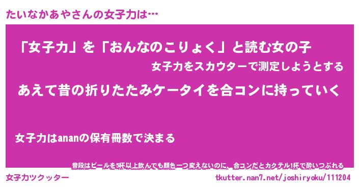 | 胡散臭い通販商品みたいなあだ名 | 『必ず成功するブレスレット…その名も「たいなかあや」』 |