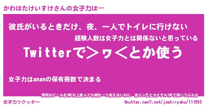 | ヘコむあだ名 | 『かわっふぃ~』『豆乳』『かわ太郎』 |
