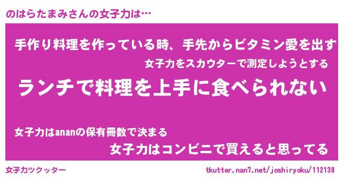 | 恥ずかしいあだ名 | 『プリティーのはらたまみ』『のはっちょ』 |