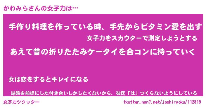 | ヒーロー風カッコイイあだ名 | 『スーパーカワミラ』『魔戒騎士カワ』 |