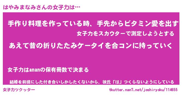 | 恥ずかしいあだ名 | 『プリティーはやみまなみ』『はやっちょ』 |