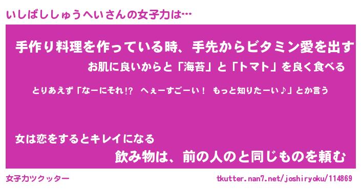 | ヘコむあだ名 | 『いしにゅー』『つくし』『いし太郎』 |