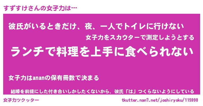 | ヘコむあだ名 | 『すずにゅー』『豆乳』『すずっ子』 |