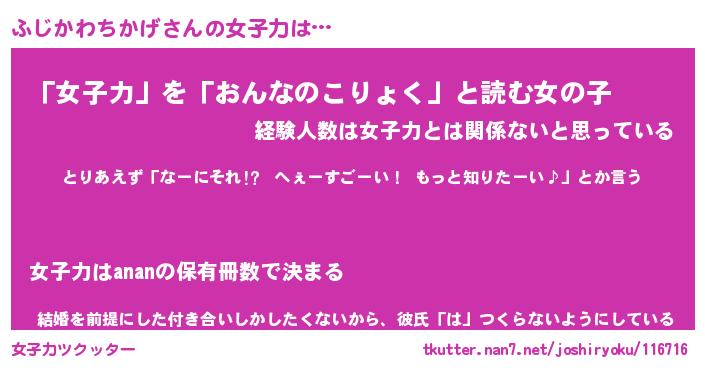 | 恥ずかしいあだ名 | 『プリティーふじかわちかげ』『ふじちん』 |