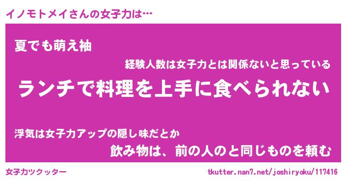 | 恥ずかしいあだ名 | 『プリティーイノモトメイ』『イノっちょ』 |