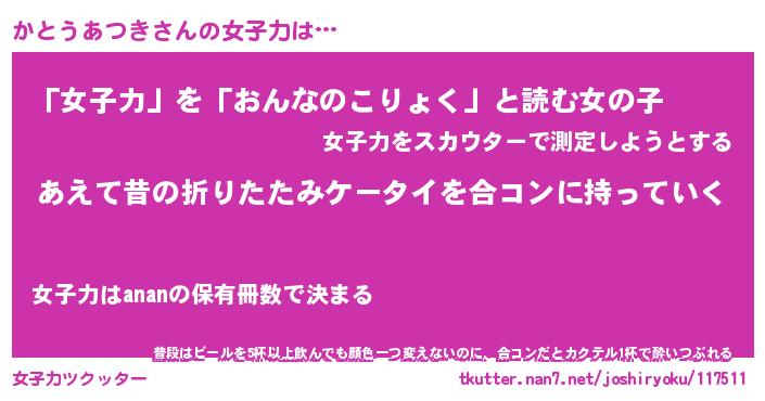 | ヘコむあだ名 | 『かとっふぃ~』『酢こんぶ』 |