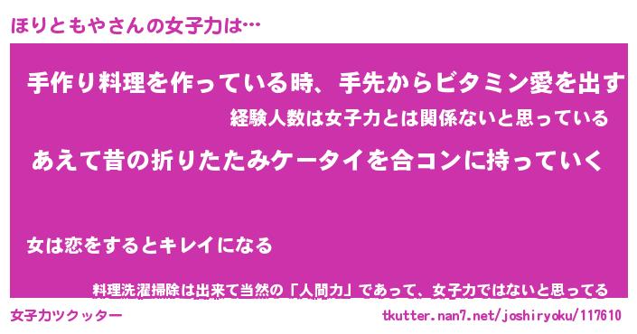 | ヘコむあだ名 | 『ほりふぇ~』『つくし』『ほりお』 |
