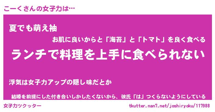 | ヘコむあだ名 | 『こーにゅー』『なまこ酢』『こーを』 |
